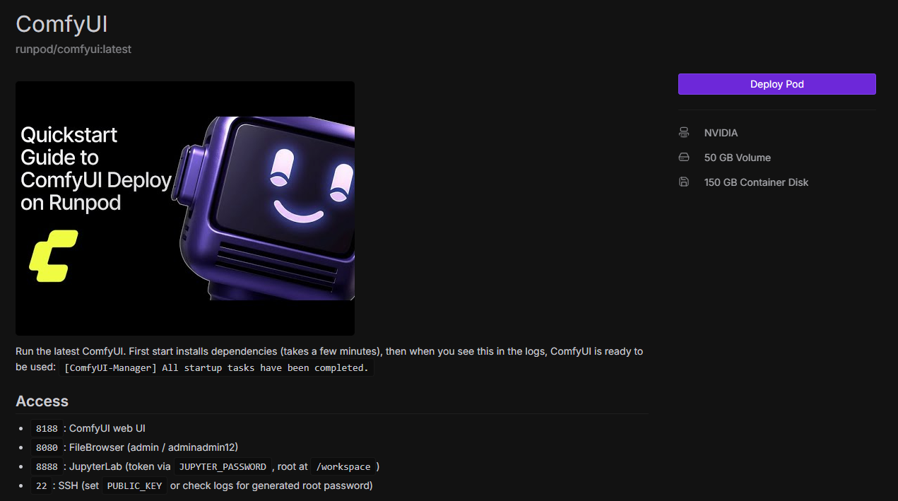RunPod has excellent GPU power but limited CPU and network performance. Initial startup can take 5-10 minutes. Get comfortable and wait until the ComfyUI port shows in the logs!